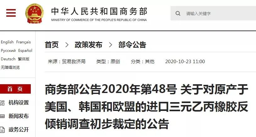 10月23日,商務部公布了EPDM反傾銷調查初裁公告,自2020年10月28日起,對原產于原產于美國、韓國和歐盟的三元乙丙膠采用保證金形式實施臨時反傾銷措施。